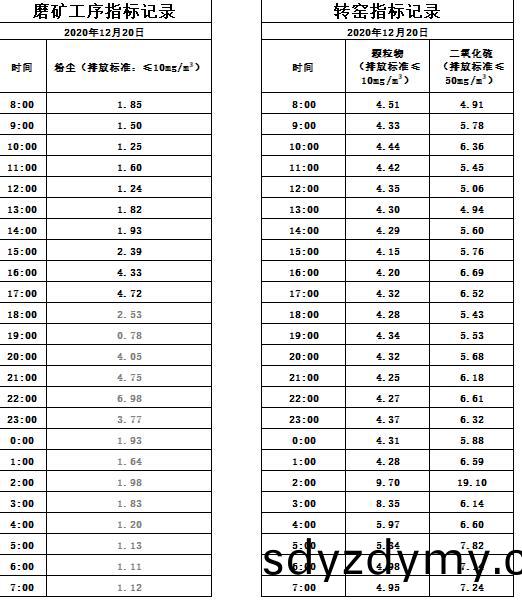 山東(dong)道恩(en)鈦(tai)業(ye)股(gu)份(fen)有限(xian)公司(si)2020年12月(yue)20磨鑛(kuang)工序煙(yan)氣及(ji)轉窰(yao)煙(yan)氣(qi)指(zhi)標數(shu)據(ju):