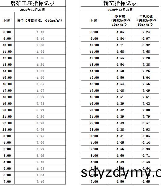 山(shan)東(dong)道(dao)恩鈦(tai)業(ye)股份(fen)有限公司2020年(nian)12月(yue)21磨(mo)鑛工序(xu)煙(yan)氣(qi)及轉(zhuan)窰煙(yan)氣(qi)指標(biao)數(shu)據: