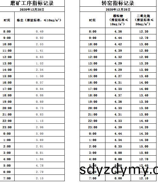 山東(dong)道(dao)恩(en)鈦(tai)業股份(fen)有(you)限公司(si)2020年12月28磨鑛(kuang)工(gong)序煙(yan)氣及轉(zhuan)窰煙(yan)氣指標(biao)數據(ju):