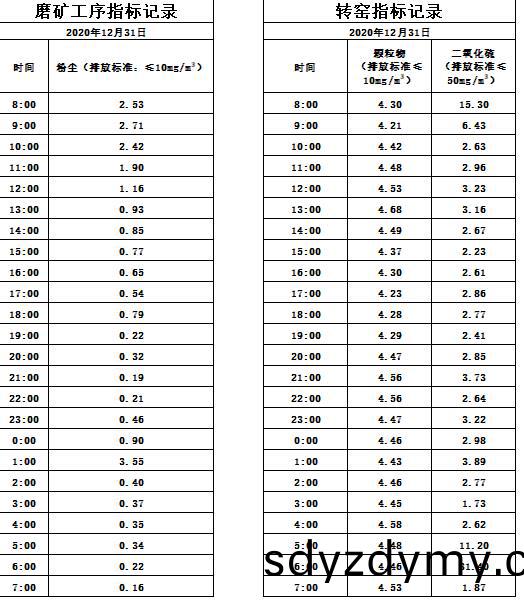 山(shan)東道恩鈦(tai)業股份有(you)限(xian)公司2020年(nian)12月(yue)31磨鑛(kuang)工(gong)序煙氣及(ji)轉窰(yao)煙(yan)氣指(zhi)標數(shu)據:
