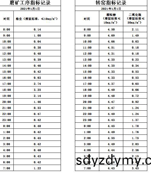 山(shan)東(dong)道(dao)恩(en)鈦(tai)業股份(fen)有限公(gong)司(si)2021年1月(yue)1磨鑛(kuang)工(gong)序(xu)煙(yan)氣(qi)及轉窰(yao)煙(yan)氣指(zhi)標(biao)數(shu)據(ju):