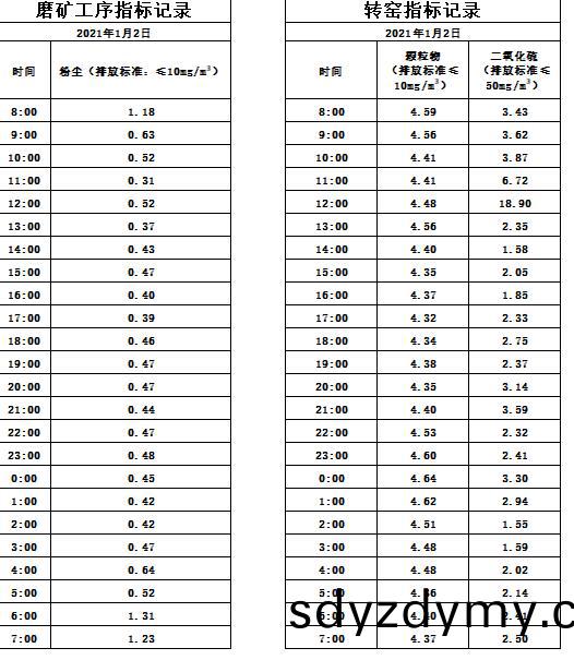 山(shan)東道恩鈦業股(gu)份有(you)限(xian)公司2021年1月(yue)2磨鑛(kuang)工(gong)序(xu)煙氣(qi)及(ji)轉(zhuan)窰煙氣(qi)指(zhi)標(biao)數據(ju):