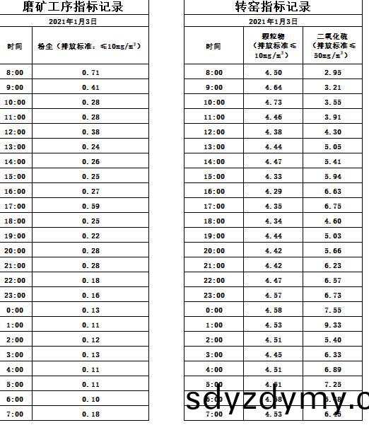 山(shan)東道(dao)恩鈦(tai)業(ye)股(gu)份有限(xian)公(gong)司(si)2021年(nian)1月(yue)3磨鑛工序煙(yan)氣(qi)及轉窰(yao)煙氣指標數(shu)據: