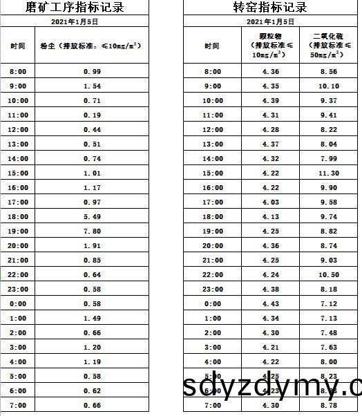 山東道(dao)恩鈦(tai)業股(gu)份(fen)有(you)限公(gong)司(si)2021年(nian)1月(yue)5磨(mo)鑛(kuang)工序煙(yan)氣及(ji)轉(zhuan)窰煙(yan)氣指(zhi)標(biao)數(shu)據(ju):
