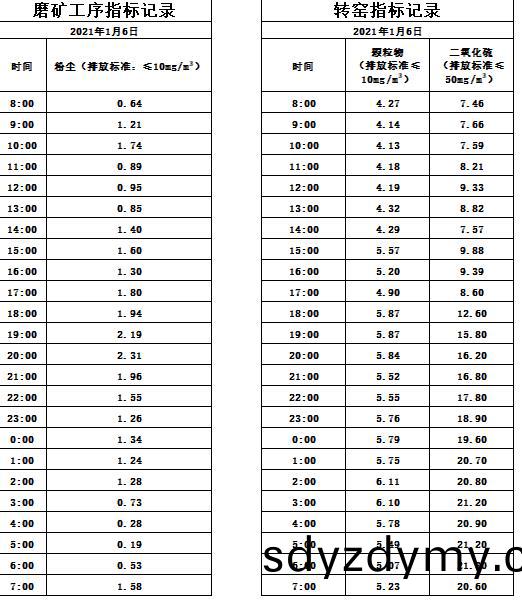 山東(dong)道(dao)恩鈦(tai)業股(gu)份(fen)有限(xian)公(gong)司(si)2021年(nian)1月(yue)6磨鑛工序(xu)煙(yan)氣及轉窰(yao)煙氣(qi)指(zhi)標數據(ju):