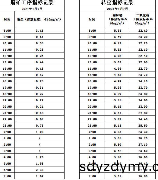 山東(dong)道恩鈦業(ye)股份有(you)限公(gong)司2021年1月7磨(mo)鑛(kuang)工(gong)序煙氣(qi)及轉(zhuan)窰(yao)煙氣(qi)指(zhi)標(biao)數據: