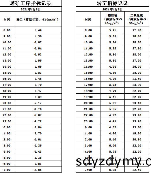 山(shan)東(dong)道恩(en)鈦業股份有(you)限(xian)公司2021年1月(yue)8磨(mo)鑛(kuang)工序煙(yan)氣(qi)及(ji)轉窰(yao)煙氣(qi)指(zhi)標數(shu)據(ju):
