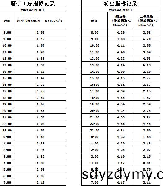 山(shan)東(dong)道恩(en)鈦業(ye)股份(fen)有限公(gong)司2021年1月10磨(mo)鑛工(gong)序煙氣(qi)及轉(zhuan)窰煙(yan)氣(qi)指標數據: