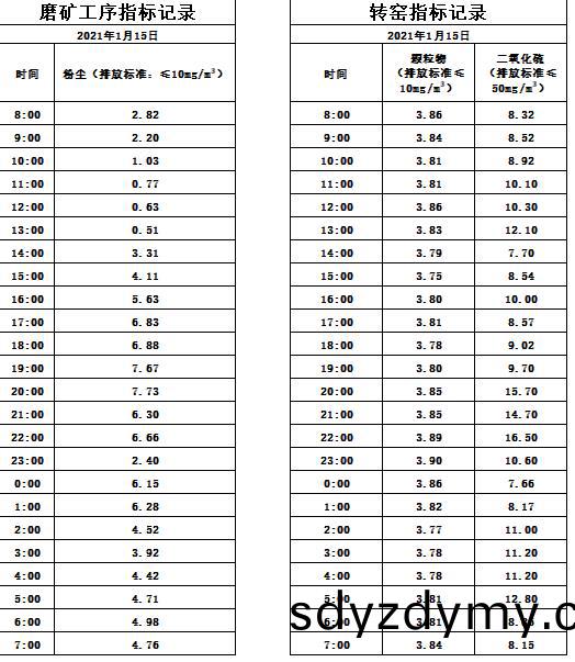 山(shan)東(dong)道(dao)恩(en)鈦(tai)業股(gu)份有限公(gong)司2021年1月(yue)15磨鑛工序煙(yan)氣及(ji)轉窰(yao)煙(yan)氣指標(biao)數據: