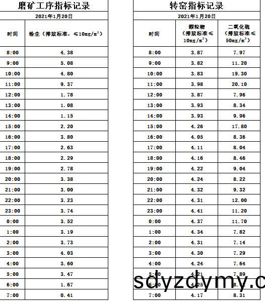 山東道(dao)恩(en)鈦業(ye)股份有限公司2021年(nian)1月(yue)20磨(mo)鑛工(gong)序煙氣(qi)及轉窰煙(yan)氣指標數據: