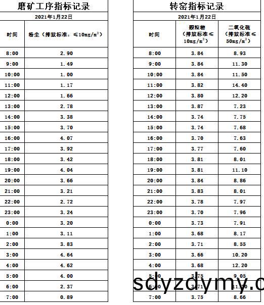 山(shan)東道恩鈦業(ye)股(gu)份(fen)有(you)限公司(si)2021年1月22磨鑛(kuang)工序(xu)煙(yan)氣(qi)及(ji)轉窰(yao)煙氣指標數(shu)據: