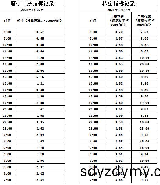 山東道恩鈦(tai)業股份(fen)有限(xian)公司(si)2021年(nian)1月27磨鑛工(gong)序(xu)煙氣及轉窰煙氣指(zhi)標數據: