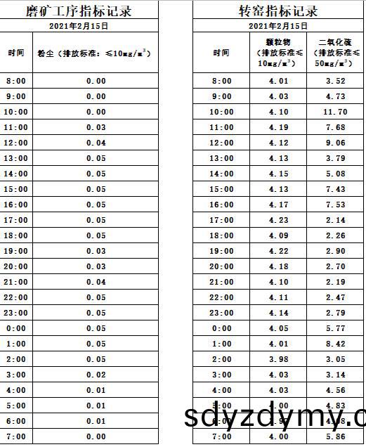 山(shan)東道恩(en)鈦(tai)業股份有限(xian)公(gong)司(si)2021年(nian)2月15日(ri)磨(mo)鑛(kuang)工(gong)序(xu)煙氣及轉窰煙(yan)氣(qi)指(zhi)標數(shu)據: