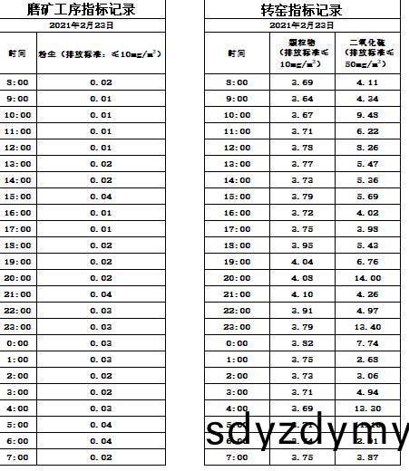 山(shan)東道恩鈦(tai)業(ye)股(gu)份有限公司(si)2021年2月23磨鑛工(gong)序(xu)煙氣(qi)及轉(zhuan)窰煙(yan)氣指標數據: