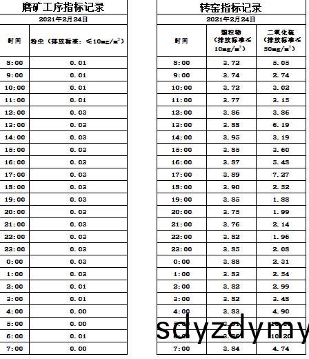山(shan)東(dong)道恩鈦業股(gu)份有(you)限公(gong)司2021年2月24磨鑛工序煙(yan)氣(qi)及(ji)轉窰(yao)煙(yan)氣指標(biao)數(shu)據(ju):