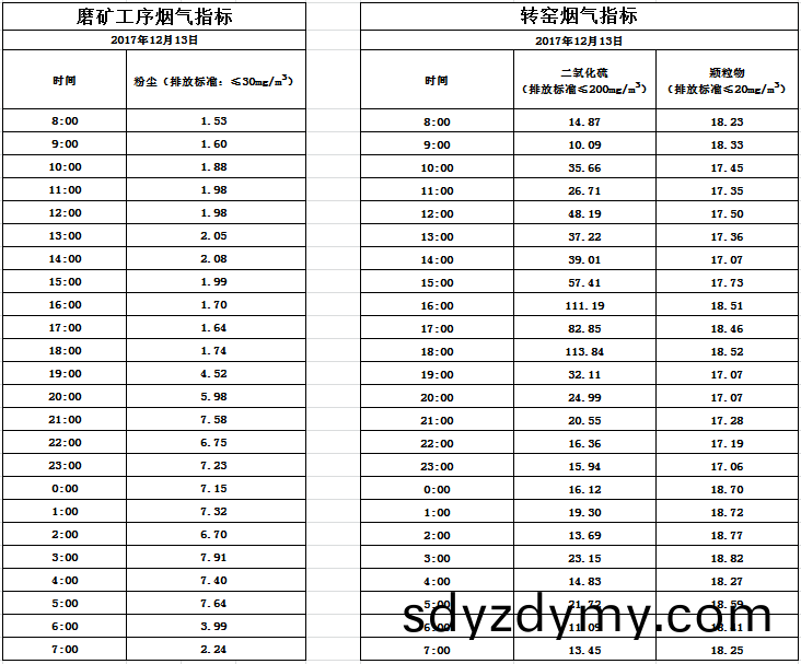 山(shan)東(dong)道恩(en)鈦業股(gu)份有(you)限(xian)公(gong)司(si)2017年12月13日(ri)磨鑛(kuang)工序煙(yan)氣(qi)及轉(zhuan)窰(yao)煙氣指(zhi)標(biao)數(shu)據(ju):山東(dong)道恩(en)鈦業股(gu)份有(you)限(xian)公(gong)司2017年(nian)12月13日(ri)磨鑛(kuang)工序煙氣(qi)及轉窰煙氣(qi)指(zhi)標(biao)數據: