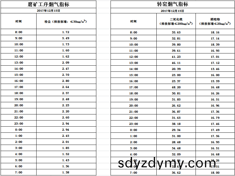 山(shan)東道恩(en)鈦業股份有(you)限(xian)公(gong)司2017年(nian)12月15日磨鑛(kuang)工序(xu)煙氣及(ji)轉窰煙氣(qi)指標(biao)數據:山東(dong)道恩(en)鈦業(ye)股份(fen)有限(xian)公司(si)2017年12月15日(ri)磨(mo)鑛工序(xu)煙(yan)氣及(ji)轉窰煙(yan)氣(qi)指標數(shu)據: