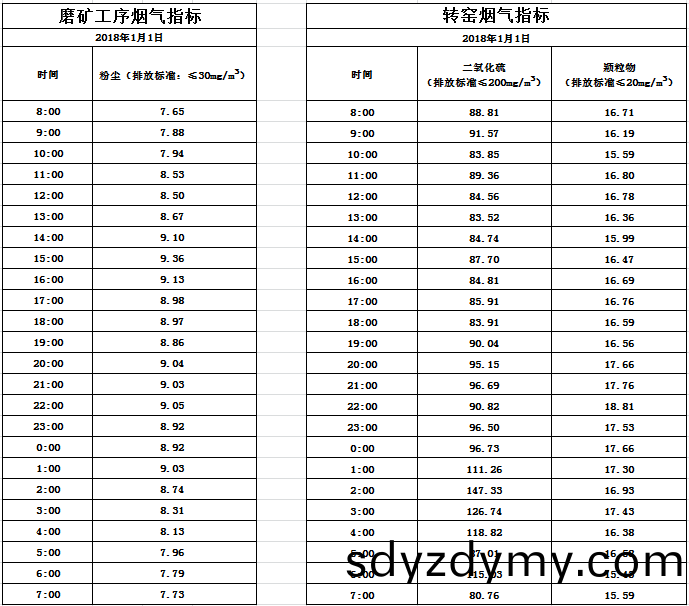 山(shan)東道(dao)恩(en)鈦(tai)業股份有限公司(si)2018年(nian)1月(yue)1日(ri)磨鑛工序(xu)煙(yan)氣及(ji)轉(zhuan)窰(yao)煙(yan)氣(qi)指標(biao)數據(ju):山(shan)東道恩(en)鈦業(ye)股份有限公司(si)2018年(nian)1月(yue)1日(ri)磨(mo)鑛(kuang)工(gong)序煙氣(qi)及轉(zhuan)窰(yao)煙氣指標(biao)數(shu)據: