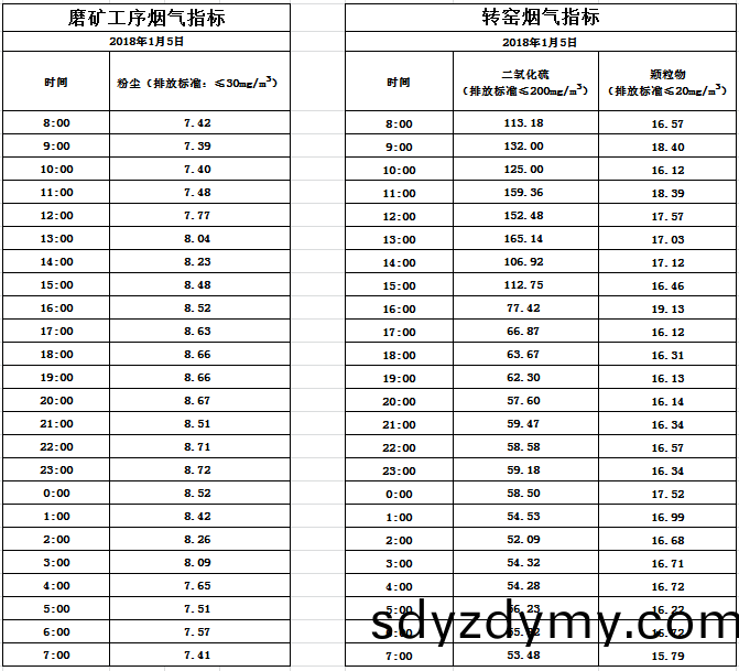 山東道恩鈦業股份(fen)有(you)限(xian)公司2018年(nian)1月5日(ri)磨(mo)鑛工(gong)序(xu)煙(yan)氣及轉窰(yao)煙(yan)氣指(zhi)標(biao)數(shu)據(ju):山(shan)東道(dao)恩鈦(tai)業股(gu)份有(you)限公司(si)2018年(nian)1月(yue)5日(ri)磨鑛(kuang)工序煙(yan)氣(qi)及轉窰煙氣指標(biao)數(shu)據(ju):
