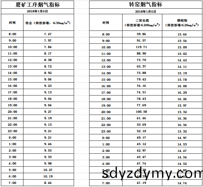 山(shan)東道(dao)恩鈦(tai)業股(gu)份(fen)有限(xian)公司2018年(nian)1月6日(ri)磨鑛(kuang)工(gong)序(xu)煙氣及(ji)轉(zhuan)窰煙氣(qi)指標(biao)數(shu)據:山(shan)東(dong)道(dao)恩鈦(tai)業(ye)股(gu)份有限公司2018年1月(yue)6日(ri)磨鑛工序(xu)煙(yan)氣及(ji)轉(zhuan)窰煙氣(qi)指標(biao)數據: