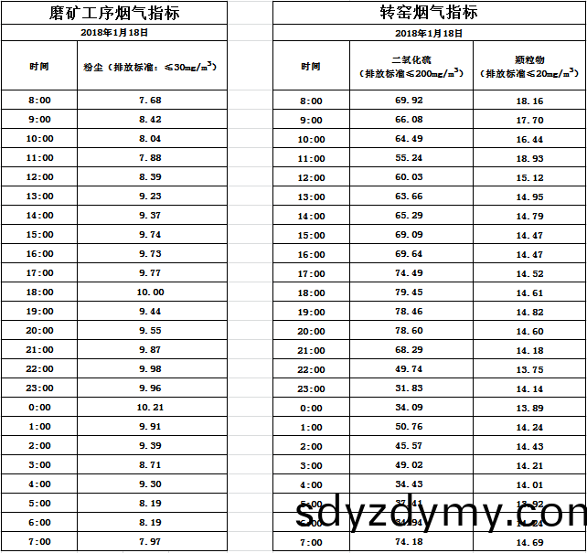 山東道(dao)恩鈦(tai)業(ye)股(gu)份(fen)有(you)限(xian)公司(si)2018年(nian)1月18日磨鑛(kuang)工序煙(yan)氣(qi)及(ji)轉(zhuan)窰煙氣(qi)指標數(shu)據:山東(dong)道(dao)恩鈦(tai)業股份(fen)有(you)限公司(si)2018年(nian)1月(yue)18日磨鑛工序(xu)煙氣及轉(zhuan)窰煙氣指(zhi)標數(shu)據(ju):