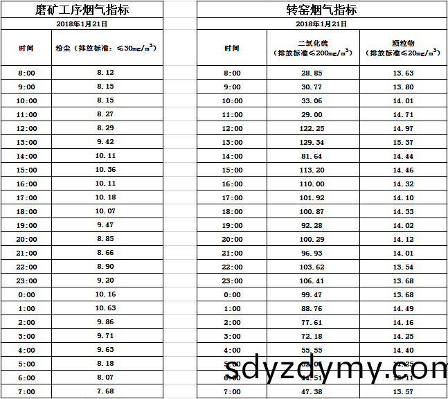 山(shan)東道(dao)恩鈦(tai)業股份有限公(gong)司(si)2018年(nian)1月21日磨鑛(kuang)工序(xu)煙氣及(ji)轉(zhuan)窰煙(yan)氣(qi)指標(biao)數(shu)據:山(shan)東道恩(en)鈦業股份有限(xian)公(gong)司(si)2018年(nian)1月21日磨鑛(kuang)工(gong)序煙(yan)氣及轉(zhuan)窰(yao)煙氣指(zhi)標數(shu)據: