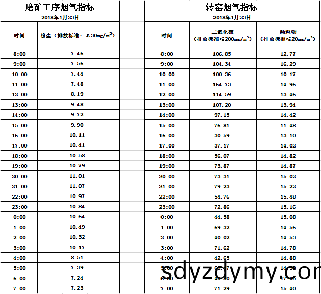 山(shan)東道恩(en)鈦(tai)業股(gu)份(fen)有限(xian)公(gong)司2018年(nian)1月23日(ri)磨(mo)鑛(kuang)工序(xu)煙(yan)氣(qi)及(ji)轉(zhuan)窰(yao)煙(yan)氣指(zhi)標(biao)數據(ju):山東(dong)道(dao)恩鈦(tai)業(ye)股份(fen)有限(xian)公司(si)2018年(nian)1月23日磨(mo)鑛(kuang)工序煙(yan)氣及(ji)轉窰煙氣指標數據:
