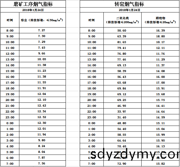 山(shan)東道(dao)恩鈦業(ye)股(gu)份有限公(gong)司(si)2018年1月24日(ri)磨(mo)鑛(kuang)工序煙(yan)氣及(ji)轉窰(yao)煙(yan)氣(qi)指標(biao)數(shu)據:山(shan)東(dong)道(dao)恩鈦(tai)業股份(fen)有(you)限公(gong)司2018年1月24日(ri)磨(mo)鑛(kuang)工序煙氣(qi)及轉窰(yao)煙氣(qi)指(zhi)標(biao)數據: