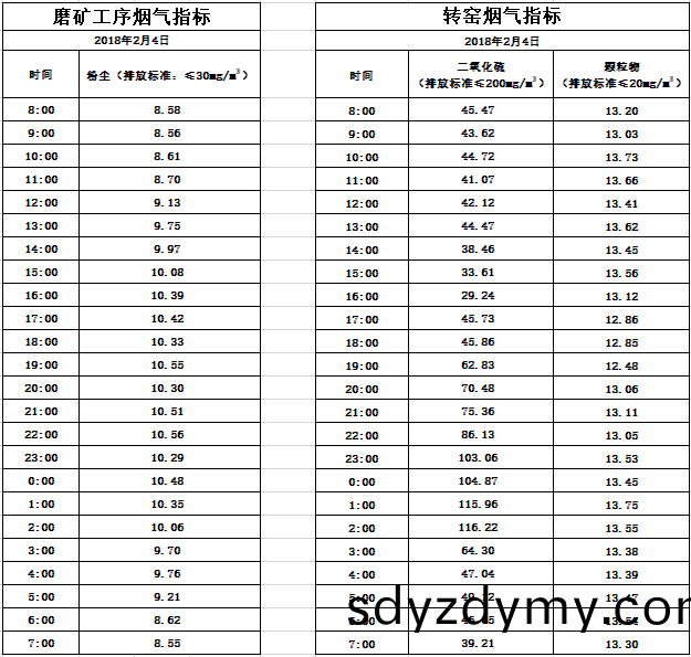 山東(dong)道(dao)恩(en)鈦(tai)業(ye)股(gu)份有限(xian)公(gong)司2018年(nian)2月(yue)4日磨(mo)鑛(kuang)工序煙氣及轉(zhuan)窰煙氣(qi)指(zhi)標(biao)數據:山(shan)東(dong)道(dao)恩鈦業(ye)股(gu)份有限(xian)公(gong)司2018年2月4日(ri)磨鑛(kuang)工序煙氣(qi)及轉(zhuan)窰(yao)煙(yan)氣指(zhi)標數(shu)據(ju):