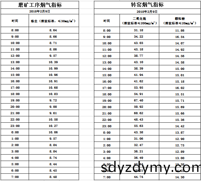 山東道恩鈦業(ye)股份(fen)有限(xian)公(gong)司2018年(nian)2月9日(ri)磨(mo)鑛工(gong)序(xu)煙(yan)氣及轉窰煙氣指(zhi)標數據(ju):山(shan)東(dong)道(dao)恩(en)鈦(tai)業(ye)股份有(you)限(xian)公(gong)司(si)2018年(nian)2月9日(ri)磨鑛(kuang)工(gong)序(xu)煙氣及(ji)轉窰煙氣指標數據: