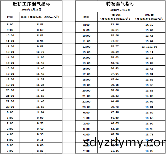 山(shan)東道恩(en)鈦業股份(fen)有(you)限(xian)公(gong)司(si)2018年(nian)2月13日(ri)磨(mo)鑛(kuang)工序(xu)煙(yan)氣及轉窰(yao)煙氣(qi)指(zhi)標(biao)數(shu)據(ju):山(shan)東(dong)道(dao)恩(en)鈦(tai)業股份(fen)有限公司(si)2018年2月13日(ri)磨鑛工序煙氣(qi)及轉窰(yao)煙氣(qi)指(zhi)標數(shu)據(ju):