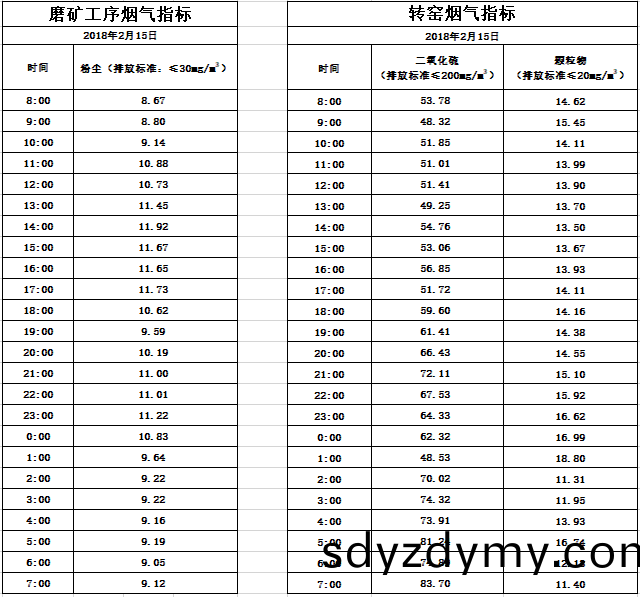 山(shan)東道恩鈦業(ye)股份有限公司(si)2018年(nian)2月15日(ri)磨鑛(kuang)工(gong)序煙(yan)氣及(ji)轉窰(yao)煙氣指標(biao)數據:山(shan)東(dong)道(dao)恩(en)鈦業(ye)股份有(you)限公(gong)司(si)2018年(nian)2月(yue)15日磨鑛工序煙氣及(ji)轉(zhuan)窰(yao)煙氣指(zhi)標(biao)數據(ju):
