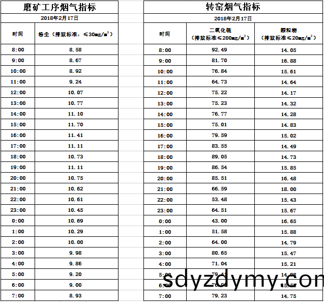 山東道(dao)恩鈦業(ye)股(gu)份(fen)有(you)限公司2018年(nian)2月(yue)17日(ri)磨(mo)鑛工序(xu)煙(yan)氣(qi)及(ji)轉窰煙氣(qi)指(zhi)標數據:山東道恩鈦業股份有(you)限(xian)公(gong)司(si)2018年(nian)2月17日(ri)磨(mo)鑛(kuang)工序(xu)煙(yan)氣(qi)及轉窰(yao)煙氣(qi)指(zhi)標(biao)數(shu)據(ju):