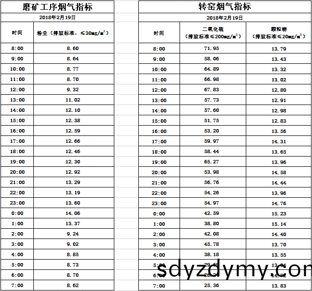 山東道(dao)恩鈦(tai)業(ye)股(gu)份(fen)有限公(gong)司2018年(nian)2月(yue)19日(ri)磨(mo)鑛工序煙(yan)氣(qi)及轉窰煙(yan)氣(qi)指(zhi)標數(shu)據:山東道(dao)恩鈦(tai)業股(gu)份(fen)有(you)限公(gong)司(si)2018年(nian)2月19日磨鑛工序煙氣(qi)及(ji)轉(zhuan)窰煙氣(qi)指標數(shu)據: