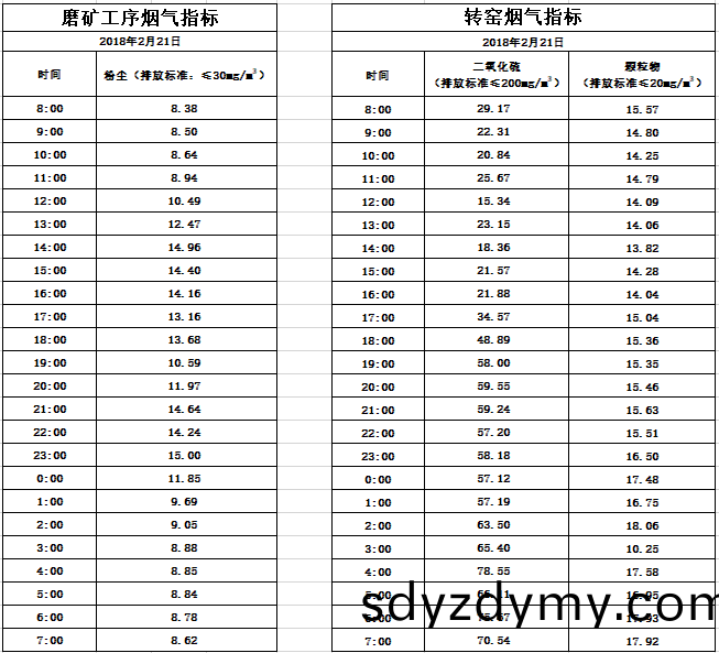 山(shan)東(dong)道恩鈦(tai)業股(gu)份(fen)有限公司(si)2018年(nian)2月(yue)21日(ri)磨鑛(kuang)工(gong)序(xu)煙(yan)氣及轉(zhuan)窰煙氣指標(biao)數據:山(shan)東(dong)道恩(en)鈦(tai)業(ye)股(gu)份有限公(gong)司(si)2018年2月21日(ri)磨(mo)鑛工序(xu)煙氣(qi)及(ji)轉(zhuan)窰煙氣(qi)指(zhi)標(biao)數據(ju):