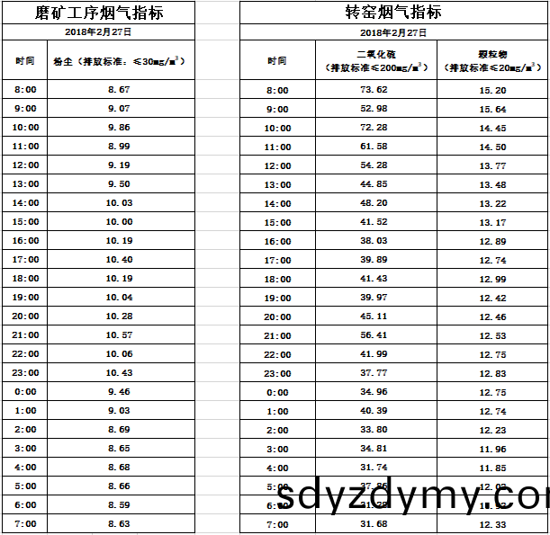 山(shan)東道恩(en)鈦業(ye)股(gu)份(fen)有(you)限(xian)公司2018年(nian)2月27日磨(mo)鑛(kuang)工序煙(yan)氣及轉(zhuan)窰(yao)煙(yan)氣(qi)指標數據(ju):山(shan)東(dong)道恩鈦(tai)業(ye)股(gu)份(fen)有限公司(si)2018年2月27日(ri)磨(mo)鑛工序(xu)煙氣(qi)及(ji)轉(zhuan)窰煙氣指(zhi)標(biao)數(shu)據: