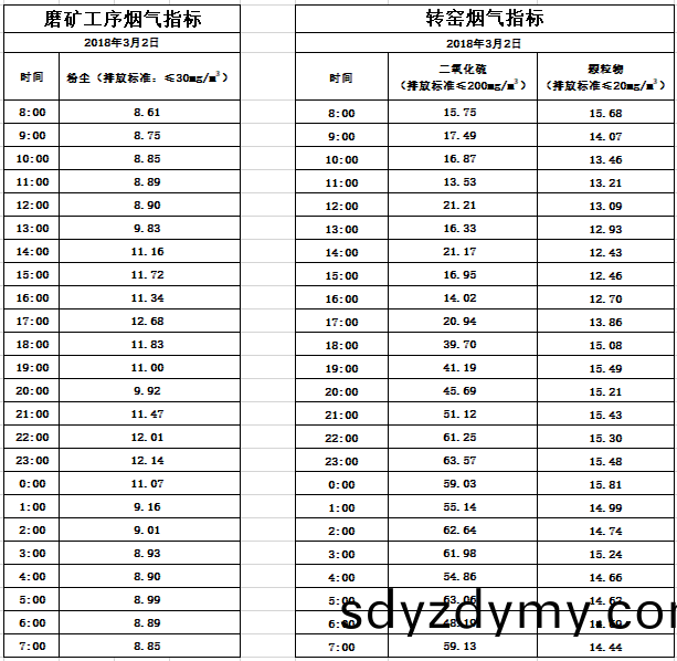 山東道恩鈦業股份(fen)有限公司(si)2018年(nian)3月2日磨鑛工(gong)序(xu)煙(yan)氣及(ji)轉(zhuan)窰煙氣(qi)指(zhi)標數(shu)據:山(shan)東道(dao)恩(en)鈦業(ye)股(gu)份有限(xian)公(gong)司2018年(nian)3月2日磨(mo)鑛工序煙(yan)氣(qi)及(ji)轉窰(yao)煙(yan)氣(qi)指標數據: