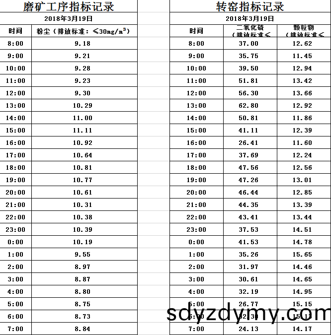 山(shan)東道(dao)恩(en)鈦(tai)業(ye)股份有限(xian)公司2018年3月(yue)19日磨鑛(kuang)工(gong)序煙(yan)氣及轉(zhuan)窰(yao)煙(yan)氣指標(biao)數(shu)據(ju):山東道(dao)恩(en)鈦(tai)業股(gu)份(fen)有限(xian)公司2018年(nian)3月(yue)19日磨鑛(kuang)工序(xu)煙(yan)氣及(ji)轉窰(yao)煙氣(qi)指(zhi)標(biao)數(shu)據(ju):