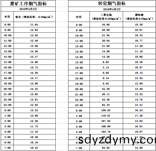 山東(dong)道(dao)恩(en)鈦業(ye)股份有限(xian)公(gong)司2018年4月(yue)2日磨(mo)鑛(kuang)工序(xu)煙氣及轉窰(yao)煙氣(qi)指(zhi)標(biao)數(shu)據:山東道恩(en)鈦(tai)業(ye)股(gu)份(fen)有(you)限公(gong)司2018年4月(yue)2日(ri)磨鑛工序(xu)煙氣及轉(zhuan)窰(yao)煙(yan)氣(qi)指標(biao)數據(ju):