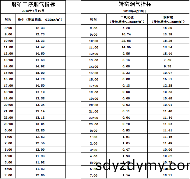 山東道(dao)恩鈦(tai)業股份(fen)有限(xian)公司(si)2018年(nian)4月19日磨(mo)鑛(kuang)工(gong)序(xu)煙氣及(ji)轉(zhuan)窰(yao)煙(yan)氣(qi)指標數(shu)據:山(shan)東(dong)道(dao)恩(en)鈦業股(gu)份(fen)有限公(gong)司2018年4月(yue)19日(ri)磨(mo)鑛(kuang)工序(xu)煙氣及轉窰煙氣(qi)指標(biao)數(shu)據: