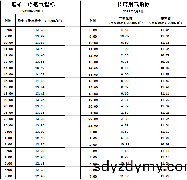 山東道恩(en)鈦(tai)業股(gu)份有(you)限(xian)公司2018年5月8日(ri)磨(mo)鑛工(gong)序(xu)煙(yan)氣及轉(zhuan)窰(yao)煙(yan)氣指標數據:山東(dong)道恩(en)鈦(tai)業股(gu)份(fen)有限公(gong)司(si)2018年(nian)5月8日(ri)磨鑛(kuang)工序煙(yan)氣(qi)及(ji)轉窰煙氣指標(biao)數據: