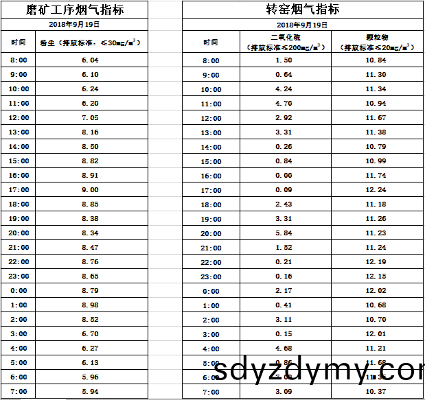 山東道(dao)恩(en)鈦業股(gu)份(fen)有(you)限公司(si)2018年(nian)9月(yue)19日磨(mo)鑛(kuang)工序煙(yan)氣(qi)及轉(zhuan)窰煙(yan)氣指標(biao)數據(ju):山(shan)東(dong)道(dao)恩(en)鈦(tai)業股份(fen)有限公司2018年(nian)9月19日(ri)磨(mo)鑛工(gong)序煙(yan)氣及(ji)轉(zhuan)窰煙(yan)氣指標數(shu)據: