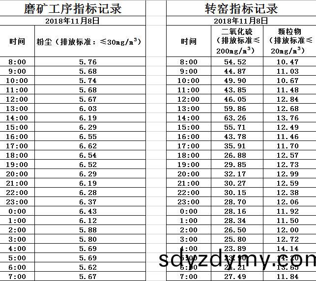 山東(dong)道恩(en)鈦業(ye)股份(fen)有限公(gong)司2018年11月(yue)8日磨(mo)鑛工序煙氣(qi)及(ji)轉(zhuan)窰煙氣(qi)指(zhi)標(biao)數(shu)據(ju):山東道恩(en)鈦業(ye)股份有(you)限(xian)公(gong)司(si)2018年11月(yue)8日磨(mo)鑛工序(xu)煙氣(qi)及(ji)轉(zhuan)窰煙氣指標數(shu)據(ju):