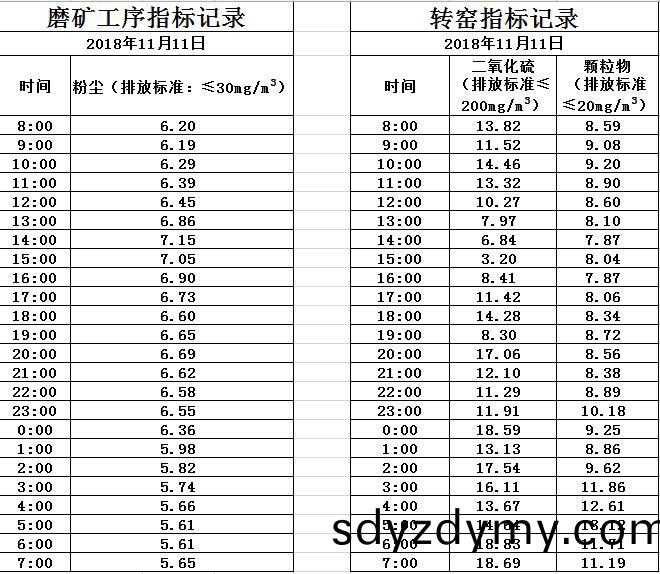 山東道(dao)恩鈦業股份(fen)有限公司(si)2018年11月11日磨鑛工序(xu)煙(yan)氣(qi)及轉窰(yao)煙氣(qi)指(zhi)標數據:山東(dong)道恩鈦(tai)業股份(fen)有限(xian)公司(si)2018年(nian)11月11日(ri)磨(mo)鑛工(gong)序(xu)煙氣(qi)及轉(zhuan)窰(yao)煙(yan)氣(qi)指(zhi)標數據(ju):