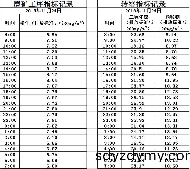 山東道(dao)恩(en)鈦(tai)業股份(fen)有限(xian)公司2018年(nian)11月(yue)24日磨鑛(kuang)工(gong)序煙氣(qi)及轉(zhuan)窰(yao)煙(yan)氣指標(biao)數(shu)據:山東(dong)道(dao)恩鈦(tai)業(ye)股份(fen)有限公司2018年11月(yue)24日磨(mo)鑛(kuang)工(gong)序煙(yan)氣及轉(zhuan)窰(yao)煙(yan)氣(qi)指(zhi)標數(shu)據(ju):
