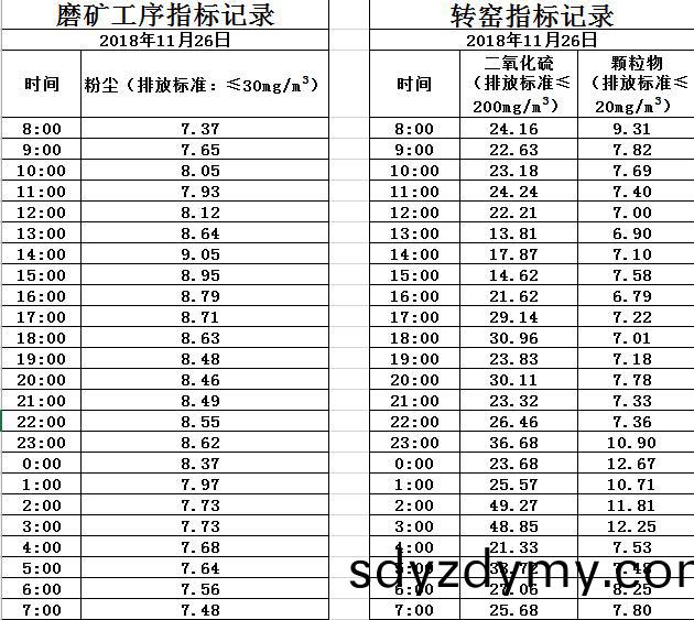 山東(dong)道恩(en)鈦業(ye)股(gu)份(fen)有限公(gong)司2018年(nian)11月(yue)26日(ri)磨鑛(kuang)工(gong)序煙(yan)氣及(ji)轉(zhuan)窰煙氣(qi)指標數據:山東(dong)道(dao)恩鈦(tai)業股(gu)份有限(xian)公司2018年(nian)11月26日(ri)磨(mo)鑛(kuang)工序(xu)煙(yan)氣(qi)及(ji)轉(zhuan)窰煙(yan)氣指(zhi)標(biao)數據(ju):