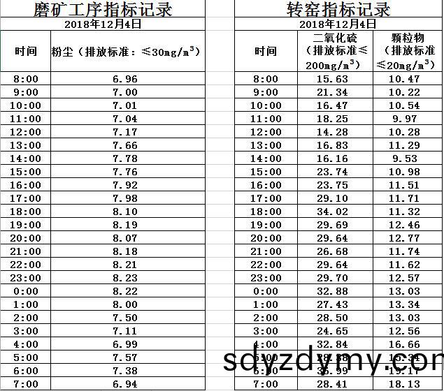 山東(dong)道(dao)恩(en)鈦(tai)業(ye)股份(fen)有(you)限公司(si)2018年(nian)12月4日磨(mo)鑛工序(xu)煙(yan)氣及(ji)轉窰(yao)煙(yan)氣(qi)指標(biao)數(shu)據:山(shan)東道恩(en)鈦業股份(fen)有(you)限(xian)公(gong)司(si)2018年(nian)12月(yue)4日(ri)磨(mo)鑛(kuang)工序煙(yan)氣及(ji)轉(zhuan)窰煙氣(qi)指(zhi)標(biao)數據: