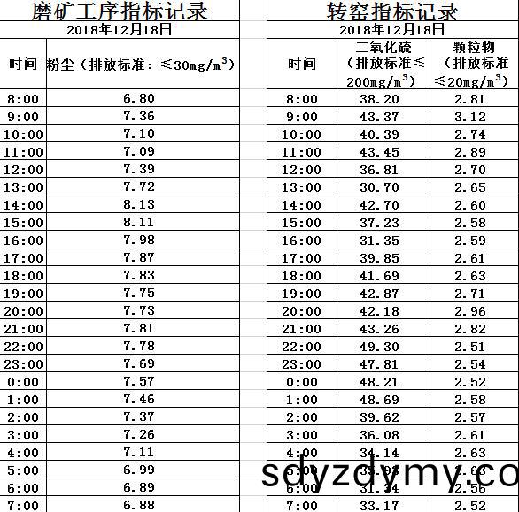 山(shan)東(dong)道恩(en)鈦(tai)業股(gu)份有限公(gong)司2018年12月(yue)18日磨鑛(kuang)工(gong)序(xu)煙(yan)氣(qi)及轉(zhuan)窰煙(yan)氣(qi)指標數(shu)據:山東(dong)道(dao)恩(en)鈦(tai)業股份有限(xian)公(gong)司2018年(nian)12月(yue)18日(ri)磨(mo)鑛(kuang)工(gong)序煙(yan)氣及(ji)轉窰煙氣指標數(shu)據(ju):