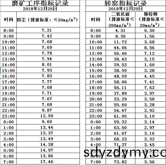 山東(dong)道恩鈦業(ye)股(gu)份(fen)有(you)限公(gong)司(si)2018年12月25日(ri)磨(mo)鑛(kuang)工序(xu)煙氣(qi)及(ji)轉窰(yao)煙(yan)氣指標數(shu)據(ju):山(shan)東道恩(en)鈦(tai)業(ye)股份有限公(gong)司(si)2018年(nian)12月(yue)25日(ri)磨(mo)鑛工序(xu)煙(yan)氣及轉窰煙氣(qi)指標數(shu)據(ju):
