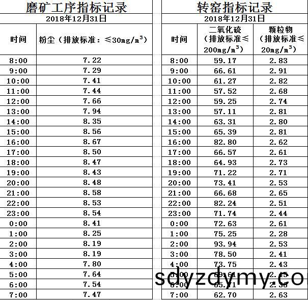 山(shan)東道恩(en)鈦(tai)業股(gu)份有(you)限公司(si)2018年(nian)12月(yue)31日磨(mo)鑛工序煙(yan)氣及轉窰(yao)煙氣(qi)指標(biao)數據(ju):山東(dong)道恩鈦(tai)業股(gu)份有(you)限(xian)公(gong)司(si)2018年12月31日磨(mo)鑛(kuang)工(gong)序煙(yan)氣(qi)及(ji)轉(zhuan)窰煙(yan)氣(qi)指標(biao)數據: